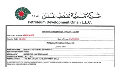 近日,久立管件被正式授予“阿曼石油開發公司(以下簡稱PDO)批準供應商證書”,批準包括了奧氏體不銹鋼、雙相鋼,超級雙相鋼和鎳基合金等材質無縫和焊接管件,